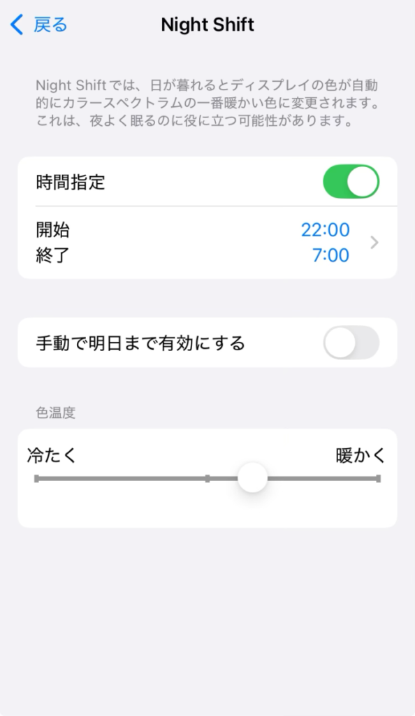 Night Shiftは、夜の時間帯に画面を暖色寄りにして、まぶしさをやわらげるための設定です。